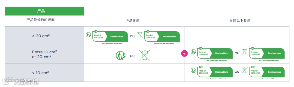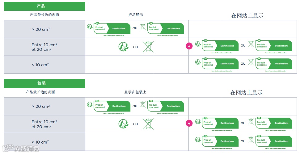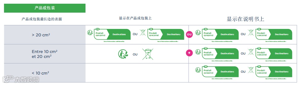 并不是,印刷标志的尺寸与您的产品及包装尺寸息息相关,法国官方回收机构根据产品是否含有包装和说明书细分了三类不同的产品情况。