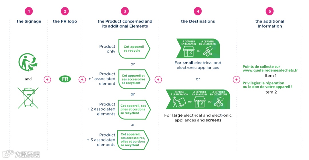 ①Triman标志+ ②产品类别图标+ ③回收方式图标+ ④Ademe的网址链接+ ⑤FR标志,如下图所示。