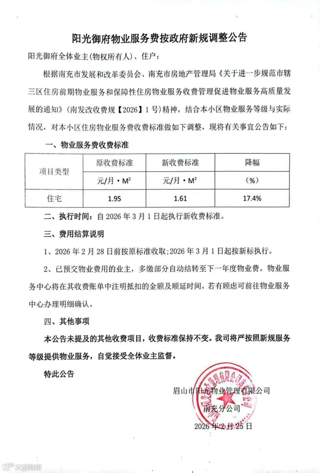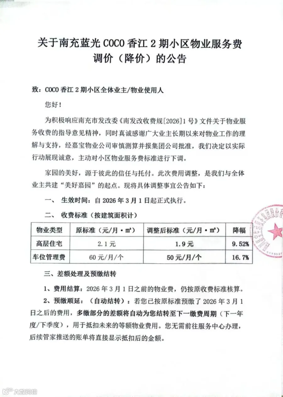 高层、洋房物业服务费:原收费1.97元/平米/月,调整为1.61元/平米/月。合院别墅1.97元/平米/月保持不变