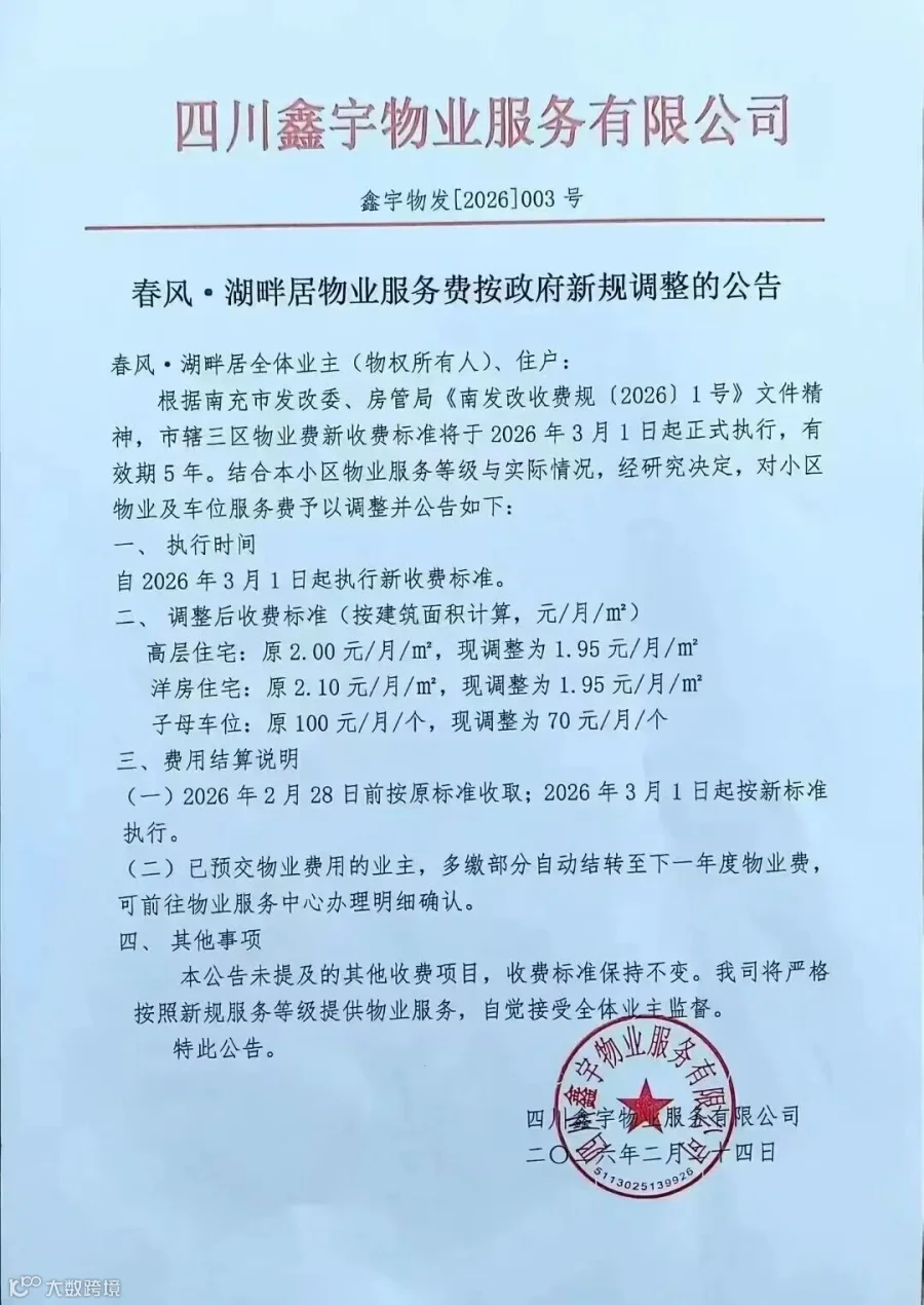车位管理服务费:标准车位由80元/个/月,调整为50元/个/月。子母车位由120元/个/月,调整为70元/个/月