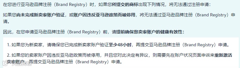 未完成新卖家账户验证,或账户违规被停用,则无法成功品牌备案。
