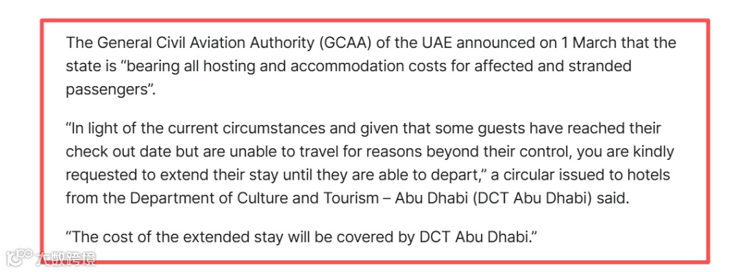 阿联酋民航总局 (GCAA) 于 3 月 1 日宣布,阿联酋将“承担所有受影响和滞留旅客的住宿费用”。
