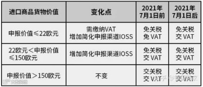 在2021年7月1日前进口至欧盟,所有货物本身价值不超过22 欧元的货件可以免征增值税。自2021年7月1日起欧盟将取消22欧元的增值税免税标准,这意味着进口至欧盟价值不超过22欧元的货件不再享有免征增值税。新增申报价值在150欧元以下的货物,2021年7月1日后直接向欧盟消费者销售价值不超过150欧元货品的电商企业,可以通过新的IOSS平台在欧盟进行与增值税有关的登记、申报和缴纳。客户无需支付预期之外的增值税,可改善客户购买体验,减少退货。欧盟税改将对电商平台和跨境卖家造成不小的影响,主要影响的是申报价值不超过150欧元货物。