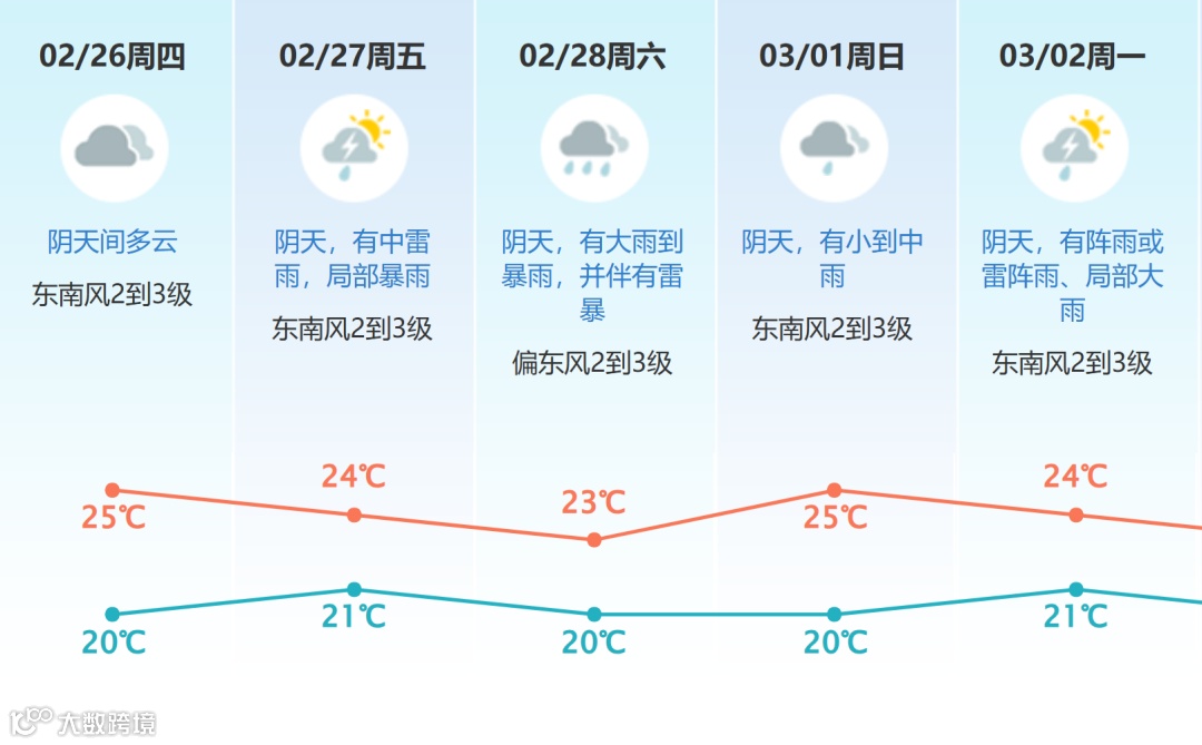 3月1日阴天,有小到中雨;3月2—3日受冷空气影响,有雷阵雨,局部大雨。
