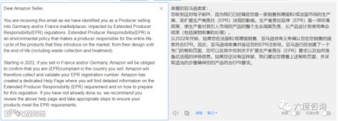 部分法国站和德国站卖家已经收到亚马逊的邮件,要求卖家保证符合EPR要求。作为亚马逊卖家,您向法国或德国销售商品,您就需要注册EPR注册号,这是一项强制性政策,没有注册EPR的卖家,亚马逊会禁止销售、强制性下架产品,产生罚金等