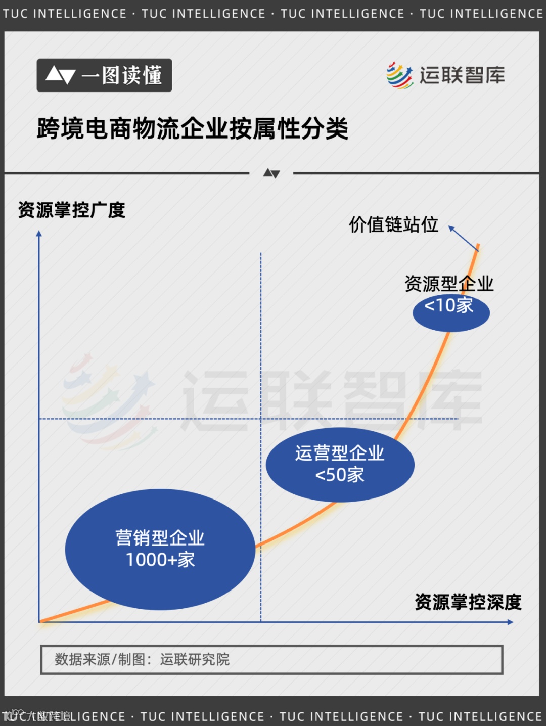 业务链条上,营销属性企业往往是资源型企业和运营型企业的货源。因此,以资源掌控的深度和广度来看的话,营销型跨境电商物流企业处于底部。