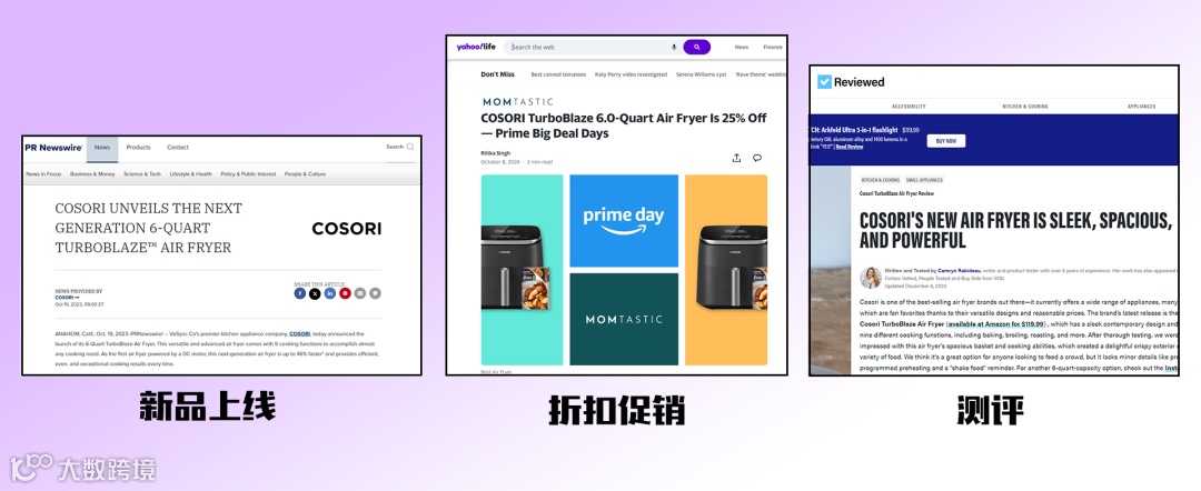 从正式上线当天发布新品预热稿件,到连续投放博客网站的测评稿件,再到大促日折扣稿件,三方并行贯穿了九合一空气炸锅推出面世的一整年。直到10月份prime day之前,依然可以在媒体网站发现九合一空气炸锅的身影。持续的稿件上线,为产品攒足了话题度,也带来了空气炸锅生命力的常青之术。