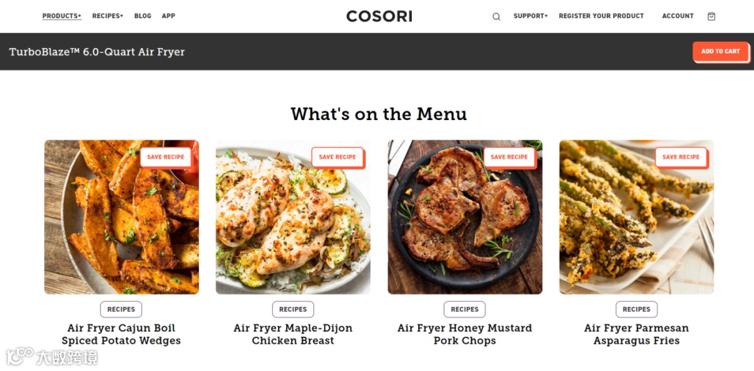 在卖点打造上,COSORI制作的产品介绍界面均以牛排,披萨,烤鸡为主,真正做到从用户角度出发,与用户使用习惯深度融合。但COSORI不止卖产品,无论是独立站还是亚马逊都贴心地列出了食谱指南,从产品到美食制作全方位包揽。