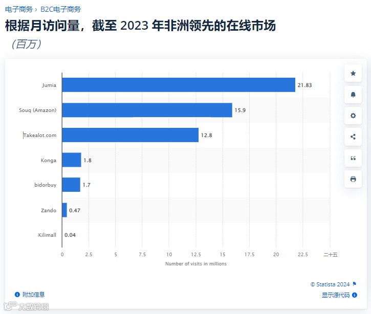 根据Statista数据,截至2023年,Jumia的每月访问量高达约2200万次,与非洲大陆其他领先的电商平台相比,这是一个遥遥领先的数字。紧随其后的是埃及的在线零售商Souq(已更名为Amazon.eg),以及南非的Takealot,每月访客量分别约为1590万和1280万。