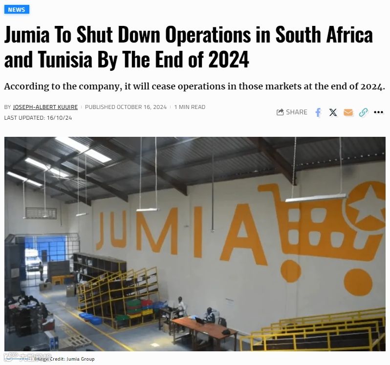 日前,Jumia宣布计划于2024年底前关闭其在南非的在线时尚零售商Zando业务及突尼斯的全部业务,旨在集中资源拓展尼日利亚等盈利更为丰厚的市场。