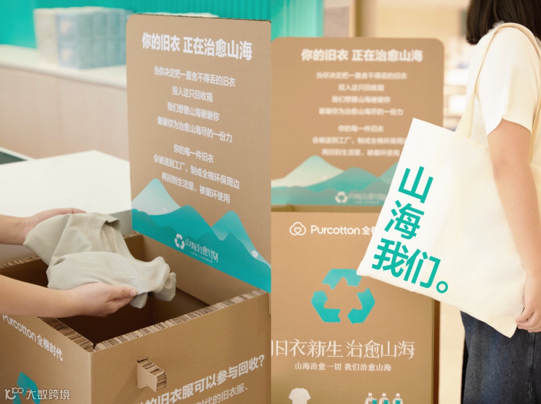 我们还在全棉时代门店设立了旧衣回收箱,鼓励用户把不再穿的衣物回收,我们会带到工厂加工成全棉环保购物袋,减少塑料的污染。