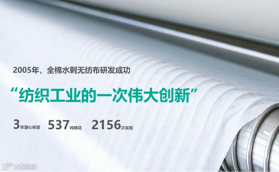 全棉水刺无纺布是一项开先河的技术,随着棉柔巾逐渐被消费者接受,越来越多的品牌加入到棉柔巾的行业中来,把它从0做到了如今100亿的市场份额,但我们始终是棉柔巾市场的领导者。