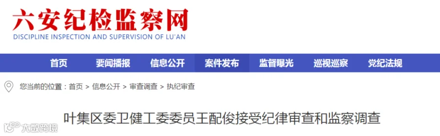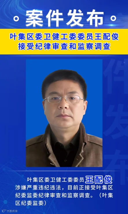 2026年2月28日,六安纪检监察网最新通报,叶集区委卫健工委委员王配俊涉嫌严重违纪违法,目前正接受叶集区纪委监委纪律审查和监察调查。
