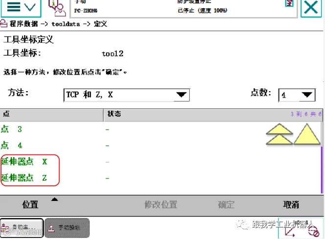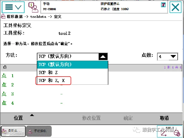 在“方法”中选择“TCP和Z,X”,采用4点法进行标定,用于确定TCP位置以及Z轴和X轴的方向。