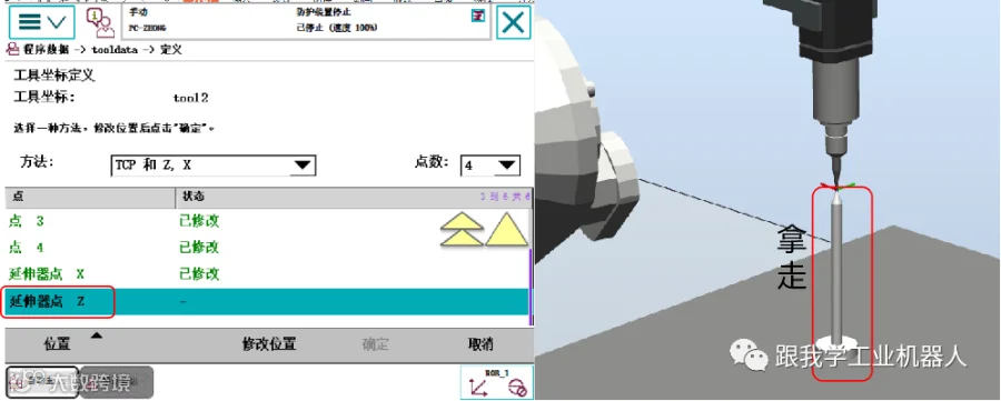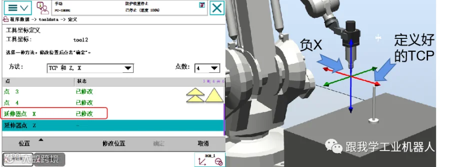 选择“延伸器点X”,将机器人移至指定姿态并对准参考点。保持姿态不变,将机器人向本体方向移动(即X轴负方向),点击“修改位置”确认X轴方向——前方为X轴正方向。