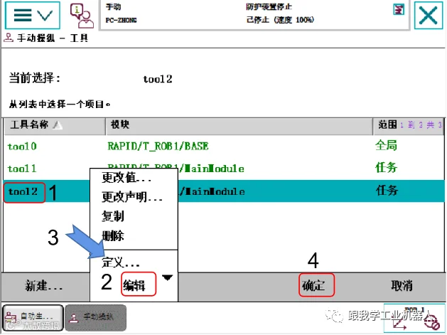 选中刚创建的工具坐标系,点击“编辑”菜单中的“定义”选项,开始配置TCP(工具中心点)及坐标轴方向。