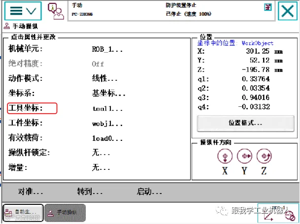 在手动操纵界面中,将动作模式设为“线性”,坐标系选择“基坐标”,并选择“工具坐标”选项。