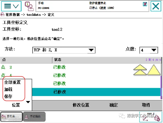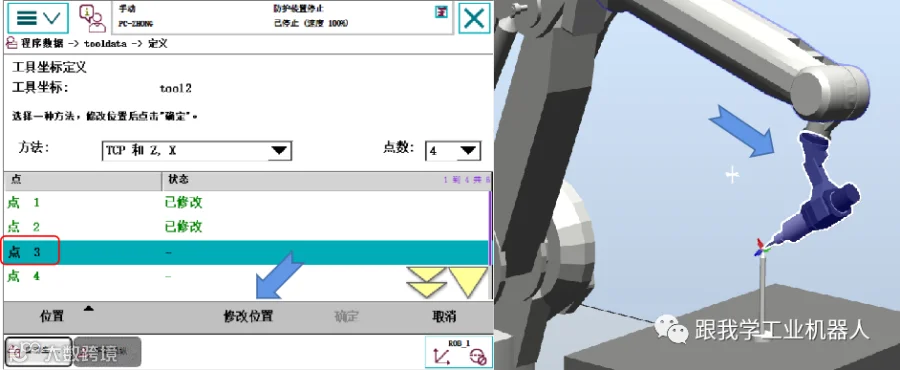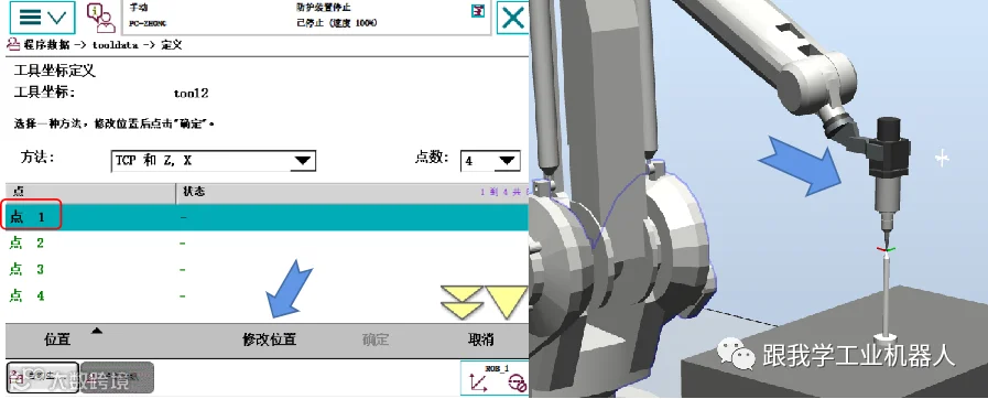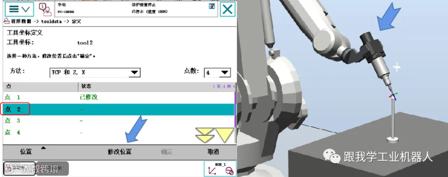 依次选择“点1”至“点4”,将机器人移动到对准参考点的不同姿态,并分别点击“修改位置”完成各点记录。