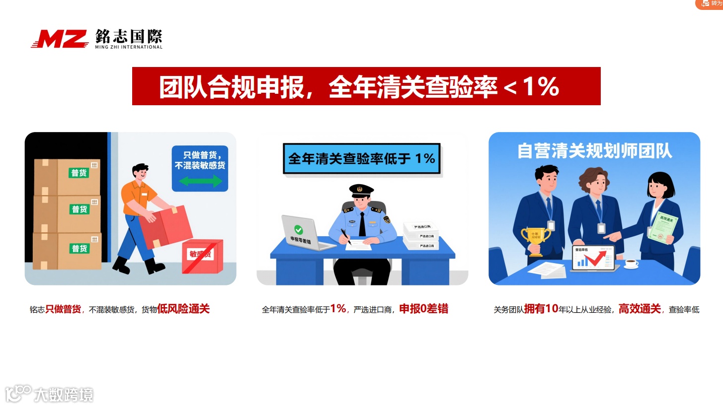 铭志的清关团队均拥有十年以上美线清关经验,不仅能为客户提供专业的申报指导,更能在货物触发查验时,凭借专业能力和海关沟通经验,快速解决问题,最大程度缩短货物扣留时间,减少时效损失。