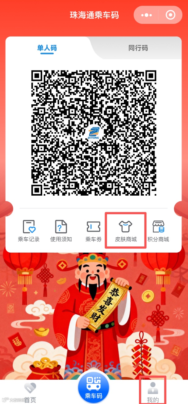 1.微信搜索「珠海通乘车码」小程序,进入乘车码主页面,找到页面中的「皮肤商城」入口,点击进入选择心仪皮肤;