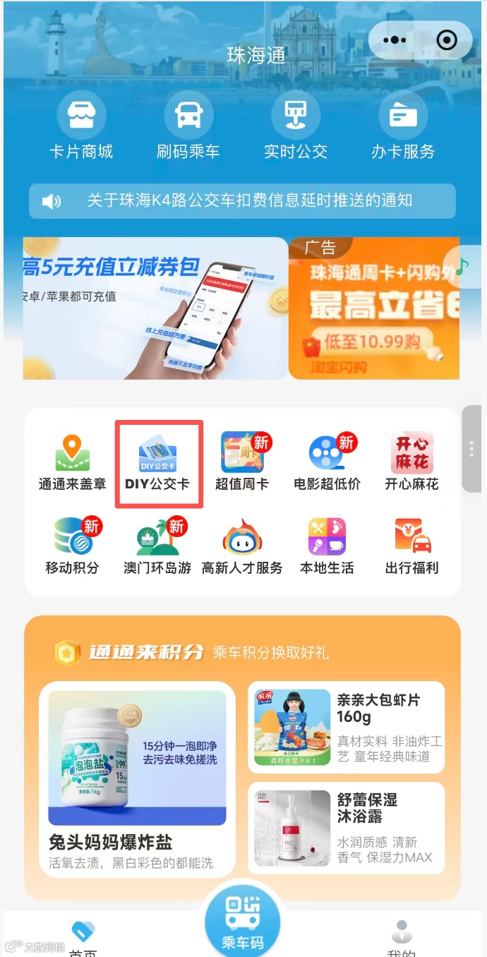 2.微信搜索【珠海通乘车码】小程序,选择【DIY公交卡】即可开始制作。