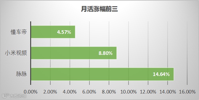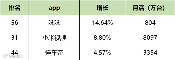 - 月活涨幅 TOP 3:脉脉涨幅最大达14.64%,其次为小米视频(8.8%)、懂车帝(4.57%)