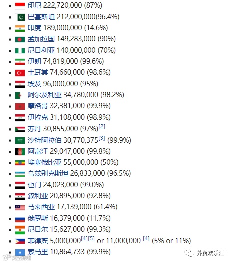世界人口中的穆斯林约16亿,约占2009年估计的世界人口68亿的23%;62%在亚太地区,20%在中东和北非,15%在撒哈拉以南非洲,2%在欧洲及美洲。其区域主要包括:印度次大陆、中亚、北高加索、阿拉伯半岛、东南亚(泰南、马来西亚、印尼、及菲律宾棉兰老岛)、东南欧巴尔干半岛部分地区及非洲的部分地区。其中,在印尼、巴基斯坦、印度、孟加拉国、土耳其、埃及的穆斯林人口占了8亿多,超过了穆斯林总人口的50℅。