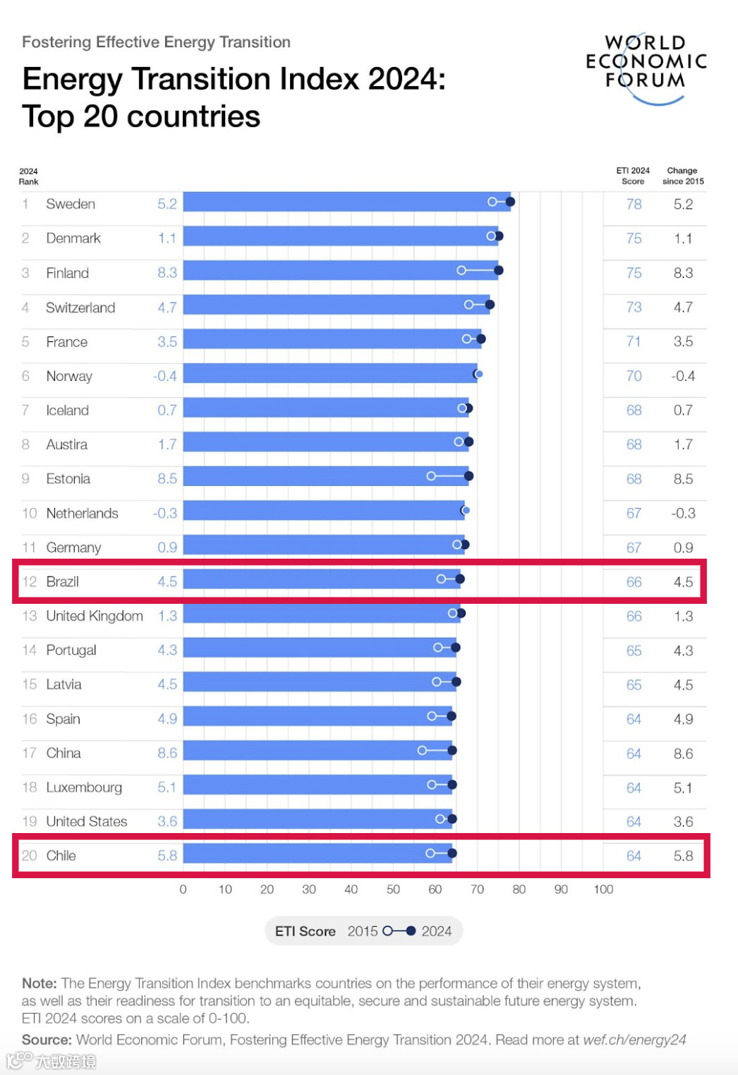 如今这个面临气候变化挑战的时代,能源转型已成为全球关注的焦点议题。世界经济论坛与埃森哲联合发布2024《促进有效的能源转型》 报告,使用能源转型指数(ETI)对120个国家当前的能源系统绩效进行基准测试,重点平衡公平性、环境可持续性和安全性以及转型准备情况。过去十年,拉丁美洲和加勒比地区的能源转型增长速度最慢,但巴西和智利在今年的指数中表现突出,跻身前20名,其中巴西位列12,智利位列20。