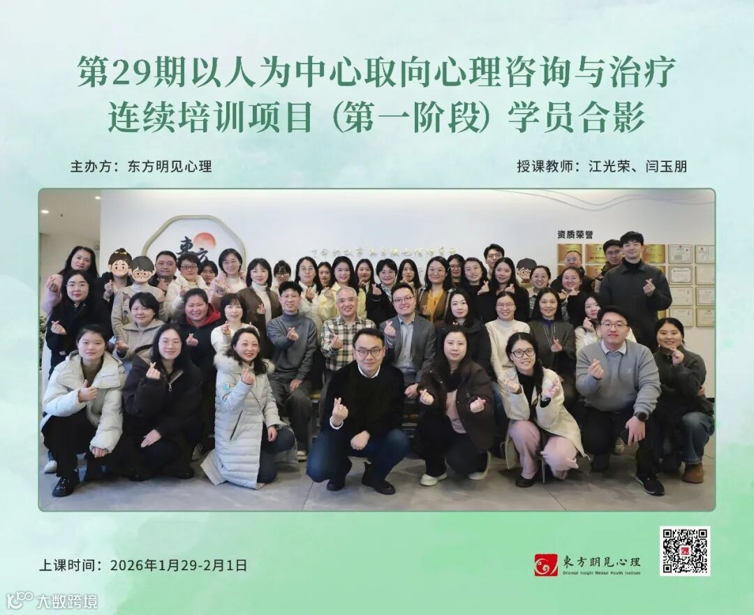2026年1月29日—2月1日,由东方明见心理举办的第29期以人为中心取向心理咨询与治疗连续培训项目第一阶段集中培训顺利开展。本阶段培训由华中师范大学江光荣教授(荣休)和东方明见心理研发中心主任闫玉朋博士共同讲授。来自全国13个省份的42名学员参加,学员主要分布于高校、中小学、医疗卫生系统、事业单位、社会开业机构等多个领域。