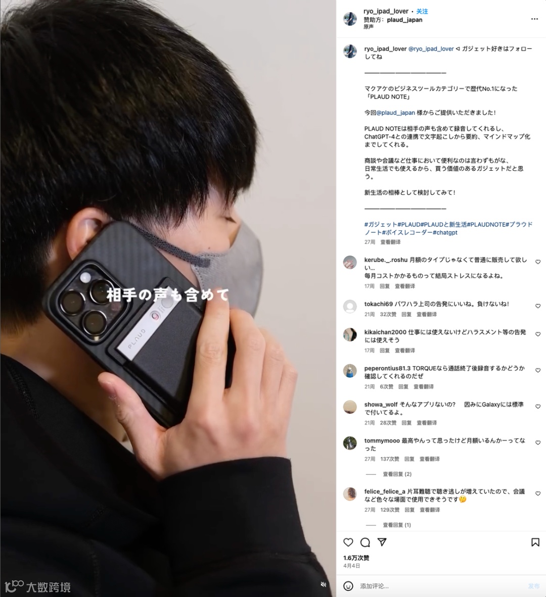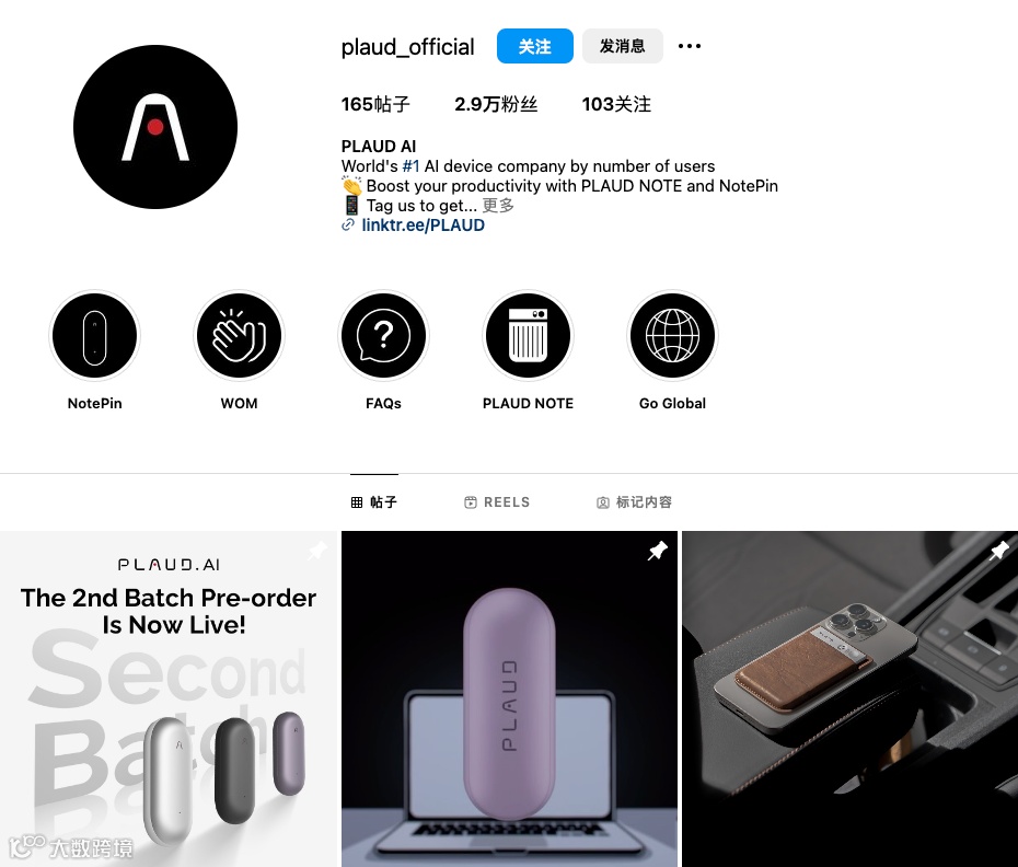 Plaud目前在五个主流的社媒平台都有运营动作,但只有Instagram官方账号的内容呈现和数据表现最好。相对于很多出海已有一段时间的中国品牌来说,Plaud的步子迈得显然更快更大而且更稳。