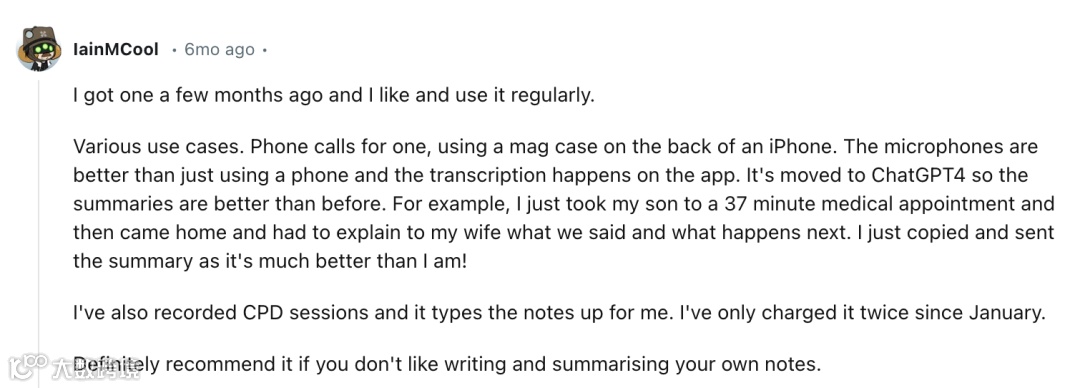 以上评论都来自于真实的用户感受,Plaud Note的问题有两点:一是在多人说话场景,Plaud Note不太能分别出哪句话是谁说的;二则是宣传中出现的AI总结功能是需要单独付费购买的。