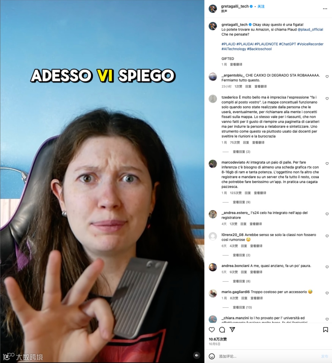 这和Plaud Note的目标客群画像重合度较高,很适合投放。在具体的Reels中,Galli通过技术分析和实际使用两个方面对Plaud Note的产品进行了介绍和种草。