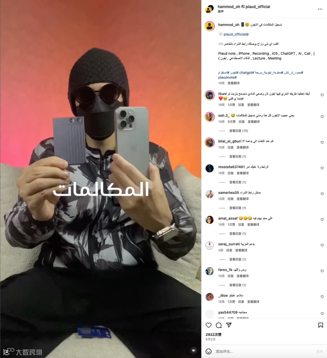 Plaud合作的红人类型跨度相当大,从拥有200多万粉丝的头部账号到只有几千粉丝的尾部KOL;从远在中东的阿拉伯科技红人到东亚日本的PC教学博主,均有所涵盖。