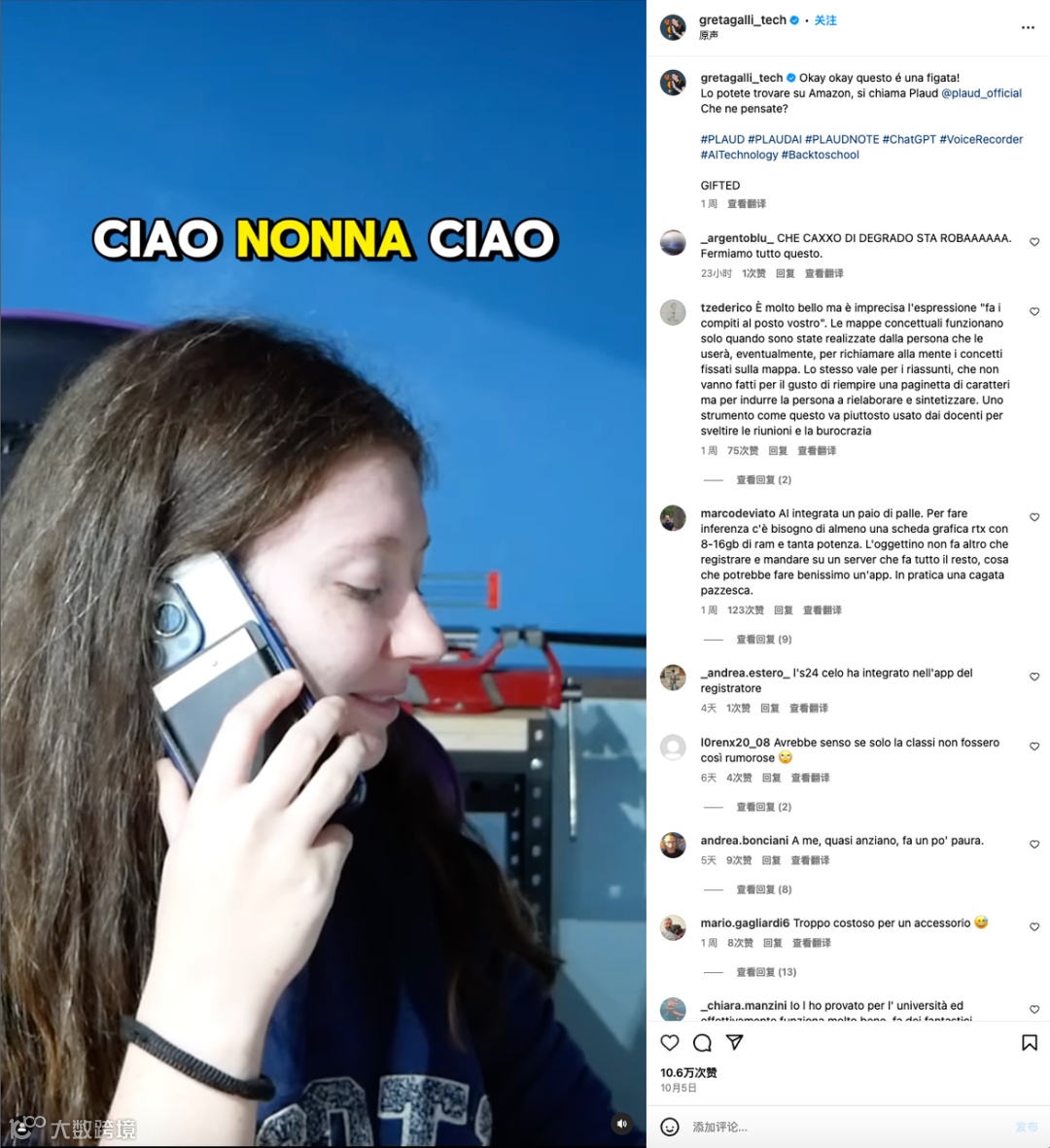 以Plaud和意大利科普类红人Galli(账号:gretagalli_tech)的合作为例。该红人经常分享很多STEM科普和研究相关的内容,有12.3万的关注数,其粉丝群体最显著的两个标签也自然被筛选为了热爱科技、喜欢新鲜事物。
