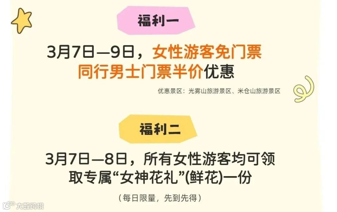 妇女节专属福利:3月7日-3月8日,女性游客免鸳鸯池索道票。