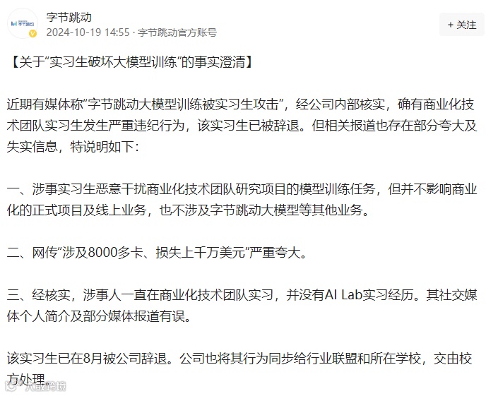 10月18日,多个微信群流传消息称,字节跳动的大模型训练遭到实习生入侵,并注入了恶意代码,导致训练结果不稳定,可能需要重新进行。据说受影响的代码使用了8000多张卡片,损失可能超过千万美元。