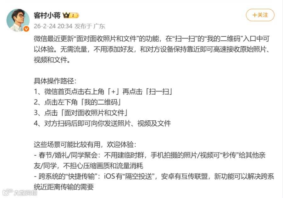 2月24日,微信员工@客村小蒋 发文称,微信最近更新“面对面收照片和文件”的功能,在“扫一扫”的“我的二维码”入口中可以体验。无需流量,不用添加好友,和对方设备保持靠近即可接收原始照片、视频和文件。