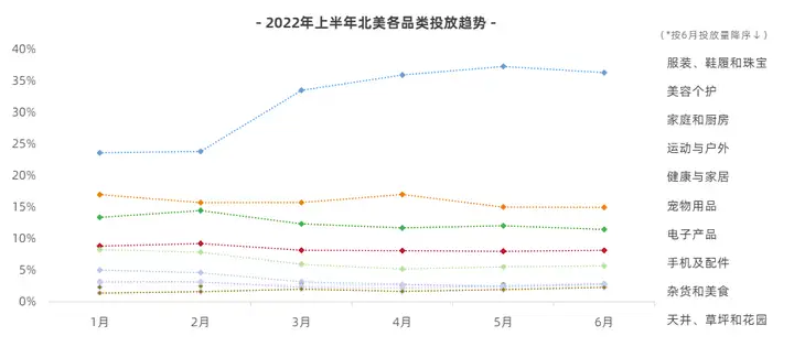 北美地区服装、鞋履和珠宝类目广告投放规模占绝对优势,3-6月均超30%,美容个户排名第二。相对而言,电子产品的投放成绩并不亮眼。