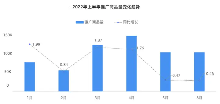 从商品推广数量来看,整体较去年有所上升,但月份之间波动幅度较大。其中1、2月份商品推广数量较少,3、4月份商品推广数量较多,均超过12万,同比增长1.87%、1.76%,5、6月份商品推广数量又有所回落。这可能是由于2月处于春节期间,数据低落,随着国际性节日的到来及复工加持,使3、4月份迎来节后小高潮。