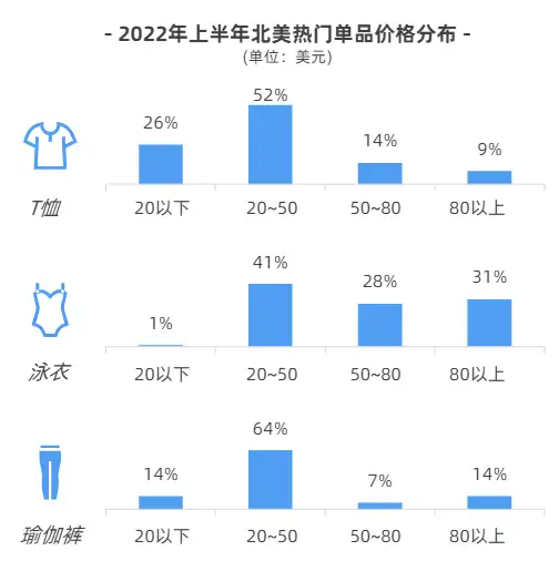 在热推的服饰产品中,T恤、泳衣和瑜伽裤客单价均几种在20~50美元之间,尤其是瑜伽裤,占比达64%。相对而言,泳衣产品的价格分布相对均衡一些,20~50、50~80、80美元以上价格区间分别占41%、28%、32%,用户对泳衣的价格敏感度相对较低。