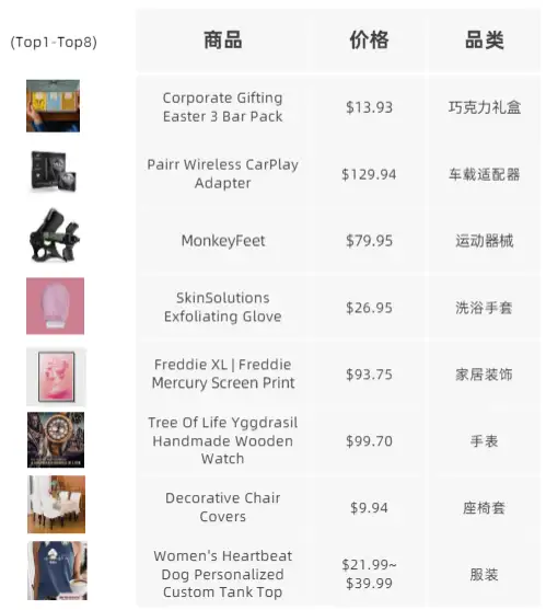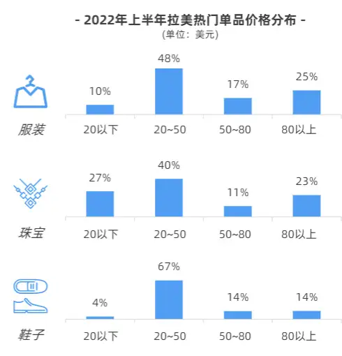 在价格偏好上,服装、珠宝和鞋子热推产品价格多集中在20~50美元区间。