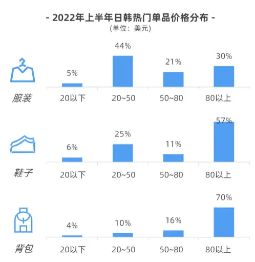 在头发产品及配饰方面,日韩市场热门产品的价格分布趋向又比较极端,26%在20美元以下,37%在80美元以上。