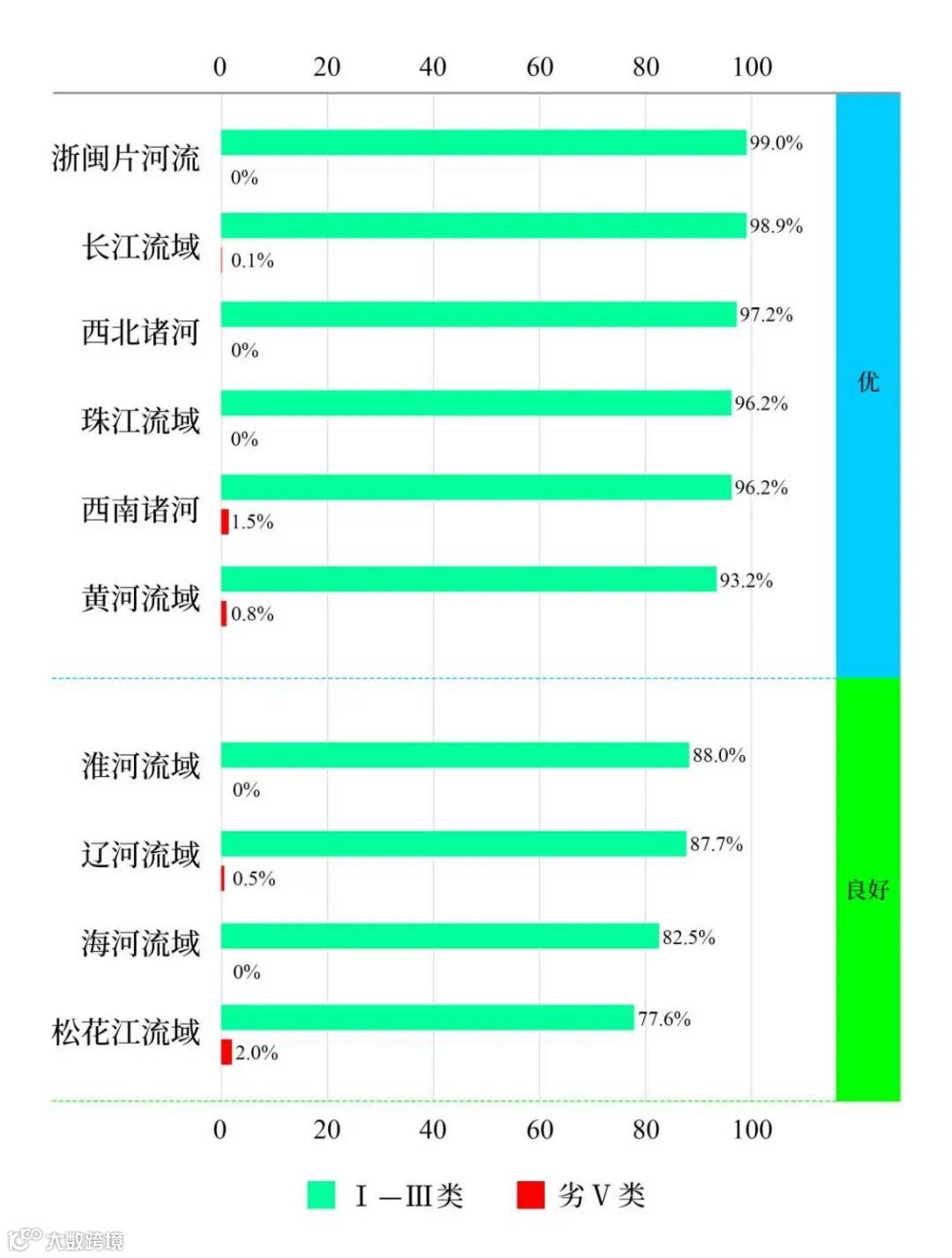 1—12月,长江、黄河、珠江、松花江、淮河、海河、辽河等七大流域及西北诸河、西南诸河和浙闽片河流水质优良(Ⅰ—Ⅲ类)断面比例为93.0%,同比上升0.6个百分点;劣Ⅴ类断面比例为0.4%,同比上升0.1个百分点。主要超标指标为化学需氧量、高锰酸盐指数和五日生化需氧量。其中,浙闽片河流、长江流域、西北诸河、珠江流域、西南诸河和黄河流域水质为优;淮河、辽河、海河和松花江流域水质良好。