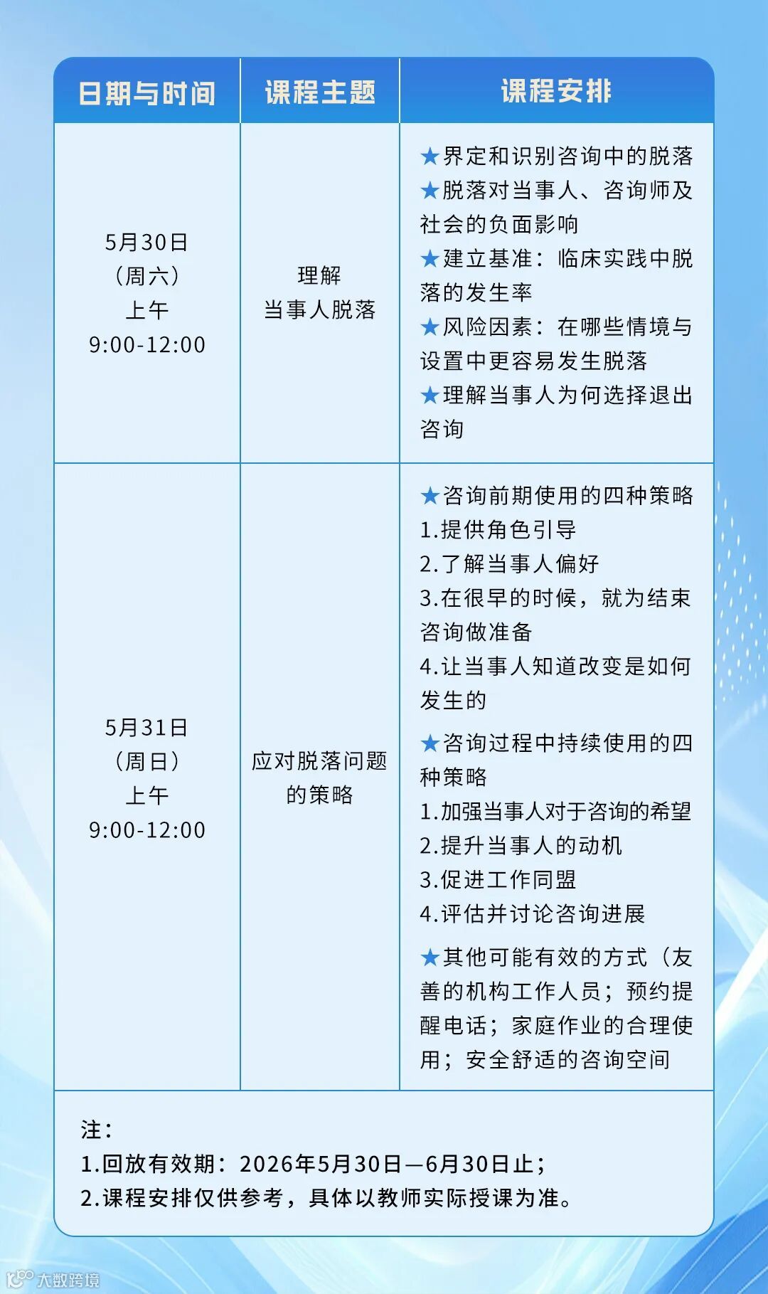 3.参加方式:本次工作坊将以线上直播+回放的形式展开,回放有效期为2026年5月30日- 6月30日止,本课程为线上直播课,自课程开始后(2026年5月30日上午9:00),将不再接受退费申请。