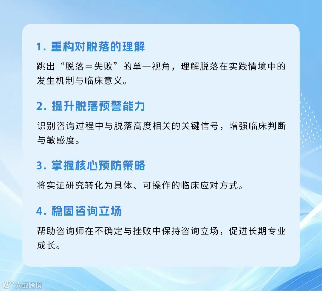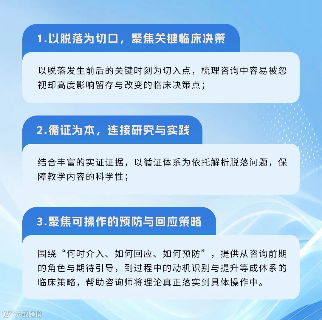 2、希望在临床实践中降低脱落率,更好地促进当事人投入并提升咨询效果的助人工作者;