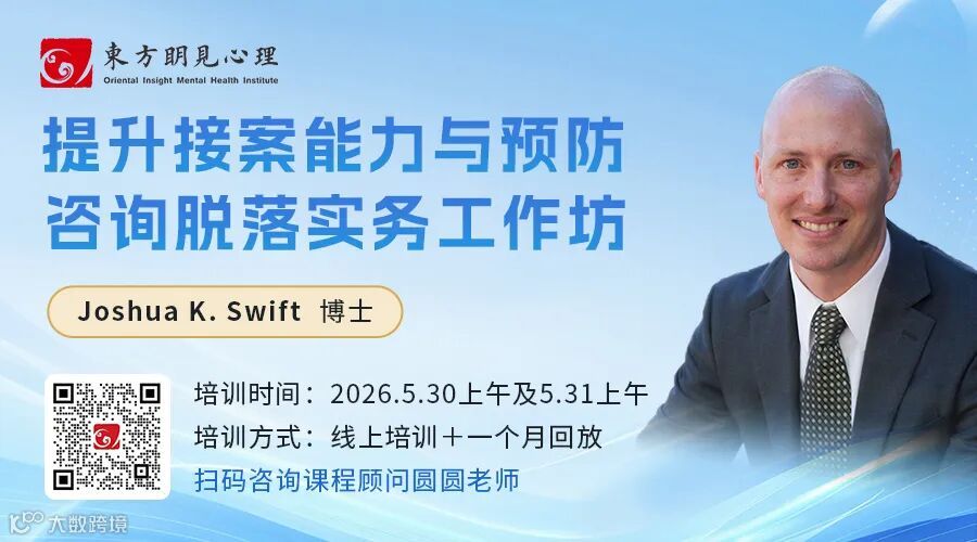 为此,东方明见心理特邀爱达荷州立大学Joshua K. Swift教授,于2026年5月30日上午、31日上午开展“提升接案能力与预防咨询脱落实务工作坊”。本工作坊将围绕心理咨询中的脱落问题展开,梳理脱落的风险因素与形成机制,并结合真实临床情境,介绍经实证研究支持的预防策略,协助咨询师在复杂与不确定的个案工作中,更有效地降低脱落发生的可能性。