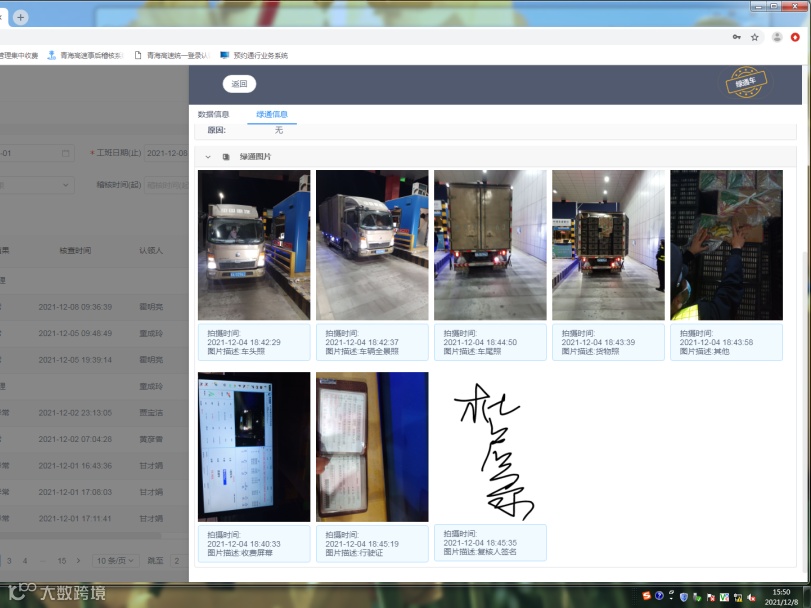 根据《青海省高速公路运营管理有限公司绿通、收割机车辆通行管理办法》,按照《鲜活农产品品种种类目录》严格查验,实行责任到人,认真做到每车必查,逐级上报,严格按照“货物、车头、车尾、车侧、证件”流程进行查验,做到查验照片清晰、真实、完整,对收费站出口绿通车辆装载货物、装载重量或容积进行多点位、全覆盖检查。