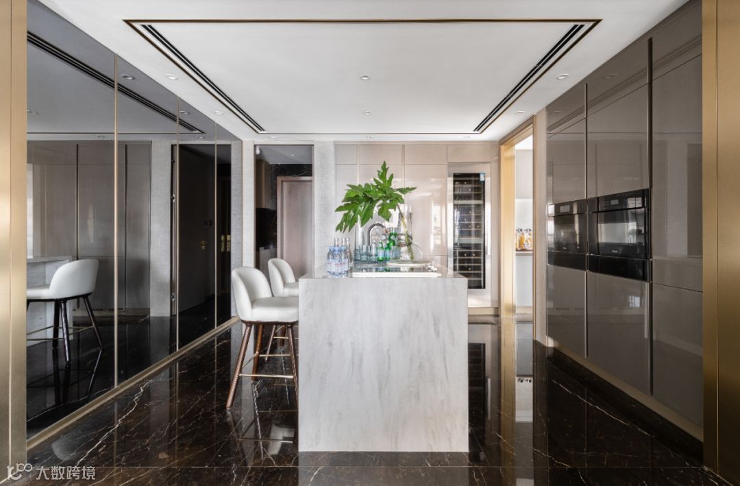 来自钻石的设计灵感,通过金属线条、玄关直纹白大理石等镜面材质,在空间内形成如钻石般的光线折射反射,又选用哑光材质地板,形成不刺眼的光线漫反射,进一步提亮空间感。