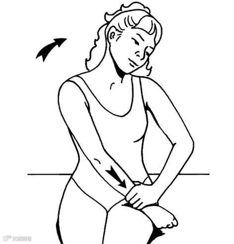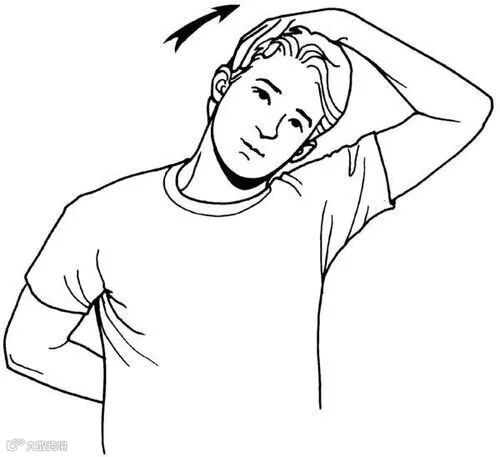 在腕上部抓住手臂向下和对侧牵拉。将头部向同侧轻轻的倾斜,维持3秒钟,重复10次。