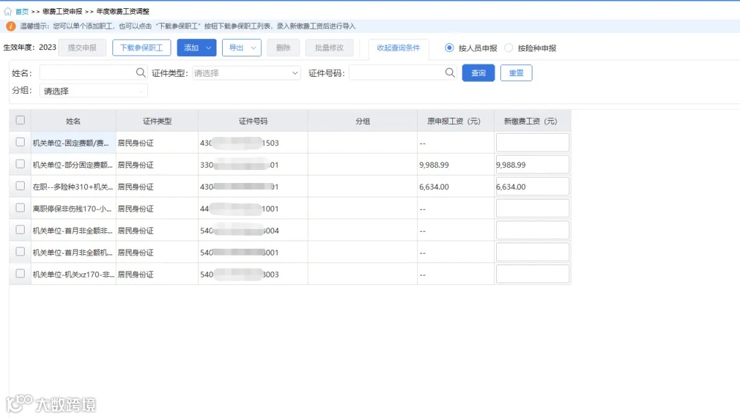 1.2024年7月1日前用人单位未向人力资源社会保障及医疗保障部门申报职工缴费工资的、已申报缴费工资的用人单位发现申报有误的、2024年7月1日以后用人单位新增职工的,使用【年度缴费工资调整】模块调整职工缴费工资。模块默认按人员申报缴费工资,缴纳机关事业单位养老保险及职业年金的人员选择按险种申报缴费工资。